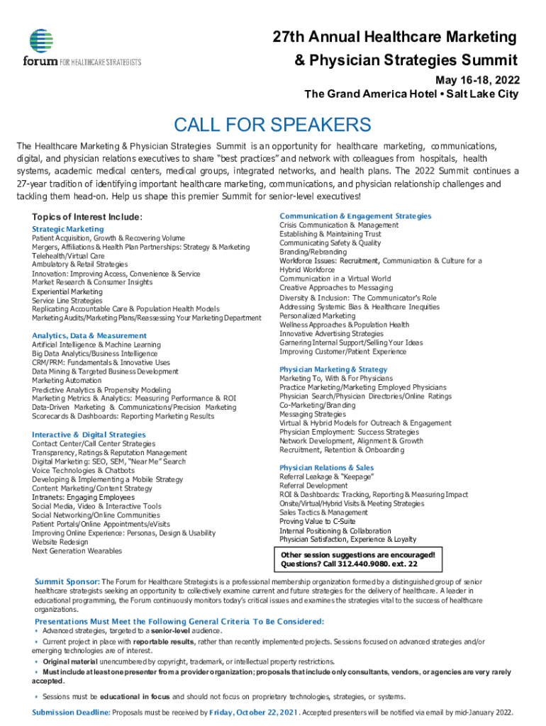 27th Annual Healthcare Marketing & Physician Strategies Summit May 1618, 2022 The Grand America Hotel Salt Lake Catcalls FOR SPEAKERS The Healthcare Marketing & Physician Strategies Summit is an opportunity