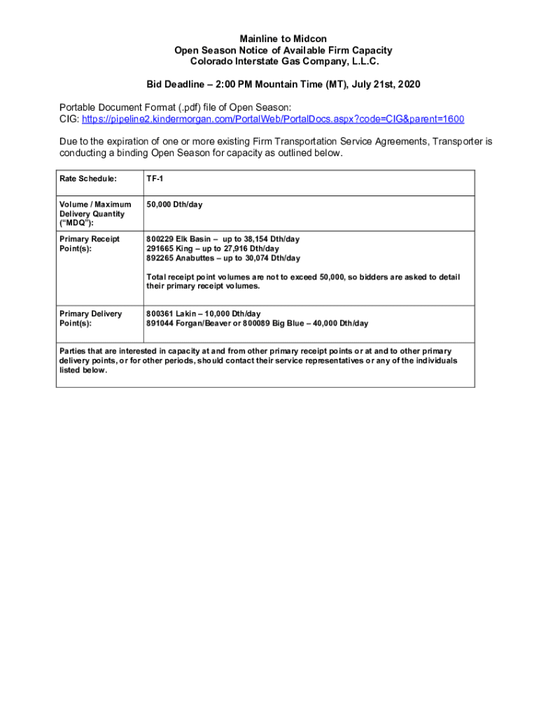 Mainline to Midcon Open Season Notice of Available Firm Capacity Colorado Interstate Gas Company, L.L.C. Bid Deadline 2:00 PM Mountain Time (MT), July 21st, 2020 Portable Document Format (.pdf) file