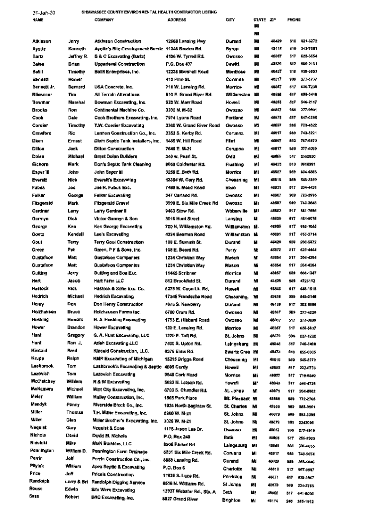 SHIAWASSEE COUNTY ENVIRONMENTAL HEALTH CONTRACTOR LISTING31Jan20COMPANYNAMEADDRESSCITYSTATEZIPPHONEMl