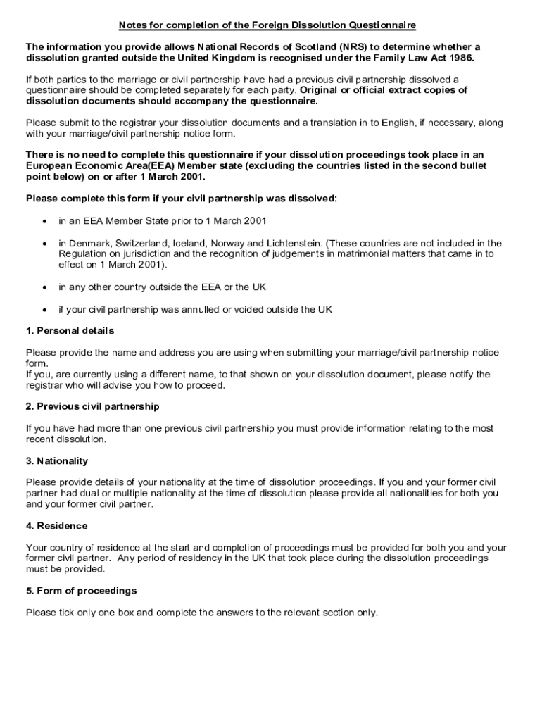 Notes for completion of the Foreign Dissolution Questionnaire The information you provide allows National Records of Scotland (NRS) to determine whether a dissolution granted outside the United Kingdom