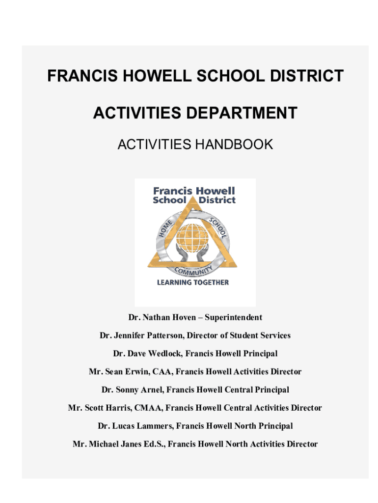 FRANCIS HOWELL SCHOOL DISTRICT ACTIVITIES DEPARTMENT ACTIVITIES HANDBOOK Dr. Nathan Haven Superintendent Dr. Jennifer Patterson, Director of Student Services Dr. Dave Wedlock, Francis Howell Principal