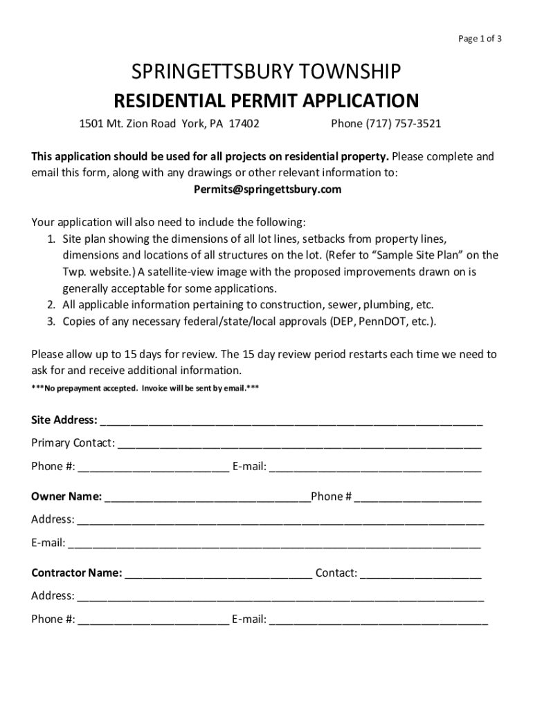Page 1 of 3SPRINGETTSBURY TOWNSHIP RESIDENTIAL PERMIT APPLICATION 1501 Mt. Zion Road York, PA 17402Phone (717) 7573521This application should be used for all projects on residential property. Please