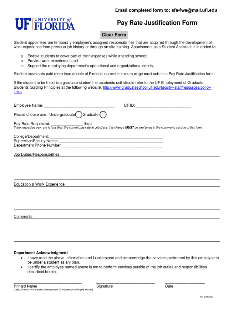 Email completed form to: sfafws@mail.ufl.eduPay Rate Justification Form Clear Form Student appointees are temporary employees assigned responsibilities that are acquired through the development of