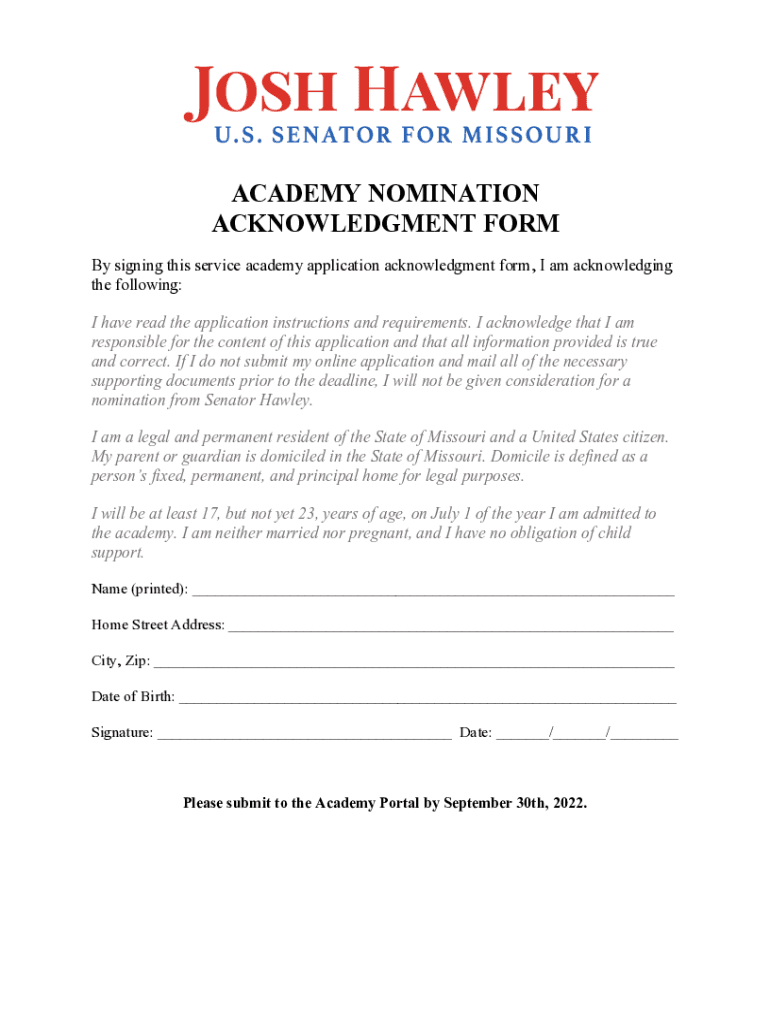 ACADEMY NOMINATION ACKNOWLEDGMENT FORM By signing this service academy application acknowledgment form, I am acknowledging the following: I have read the application instructions and requirements.