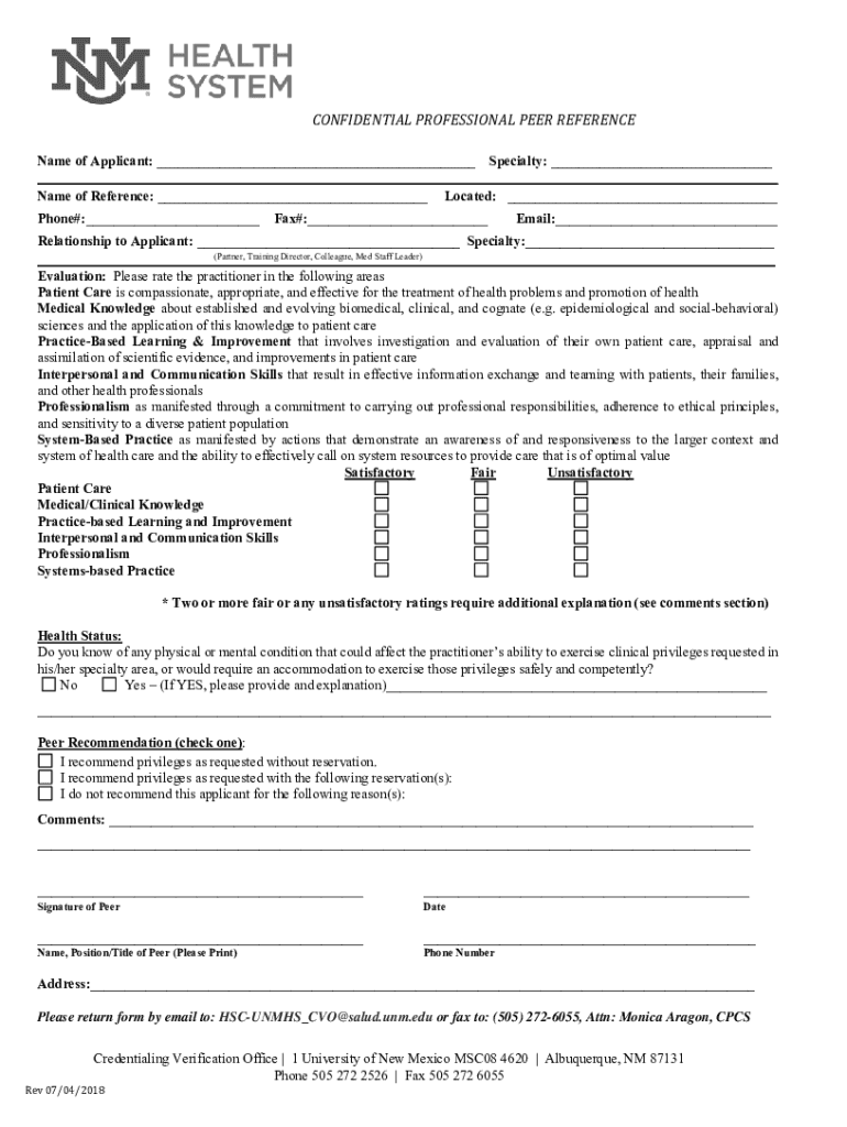 CONFIDENTIAL PROFESSIONAL PEER REFERENCEName of Applicant: ___ Specialty: ___ ___ Name of Reference: ___ Located: ___ Phone#:___Fax#:___Email:___Relationship to Applicant: ___ Specialty:___ (Partner,