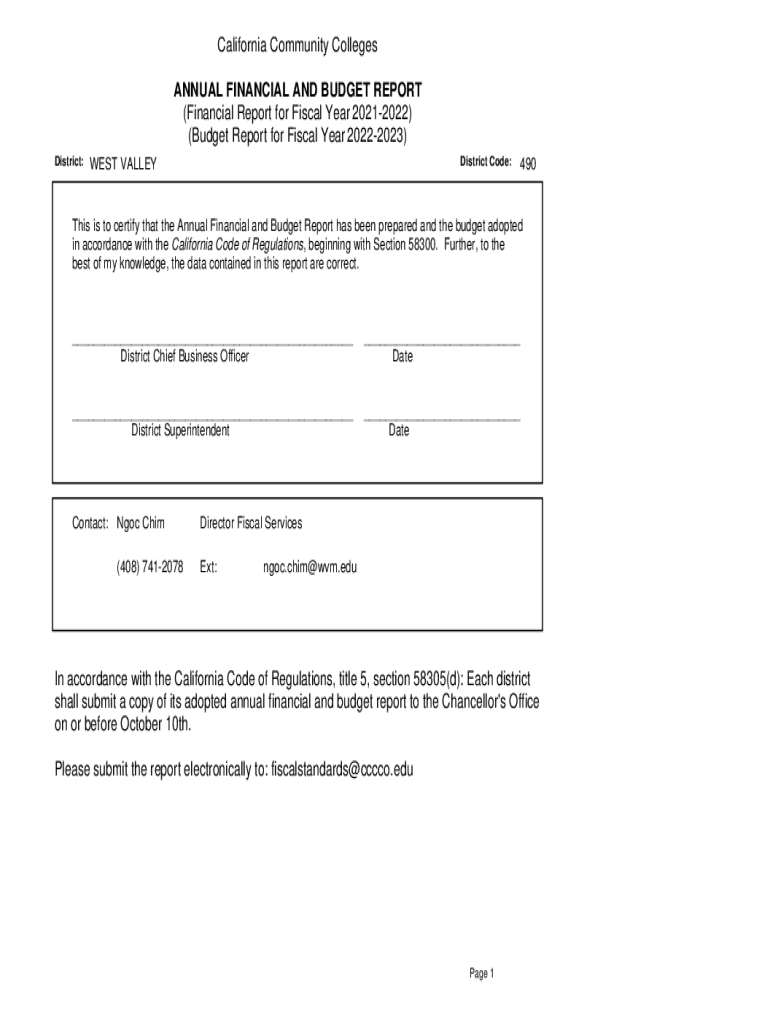 California Community Colleges ANNUAL FINANCIAL AND BUDGET REPORT (Financial Report for Fiscal Year 20212022) (Budget Report for Fiscal Year 20222023) District:District Code:WEST VALLEY490This is to