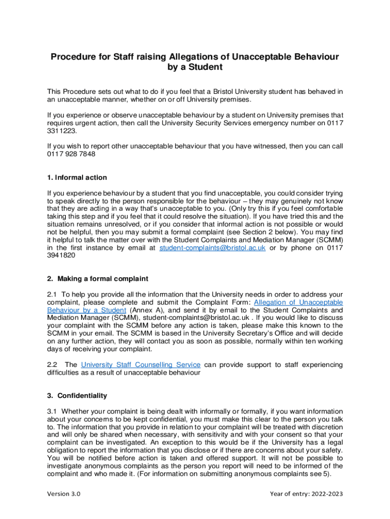 Procedure for Staff raising Allegations of Unacceptable Behavior by a Student This Procedure sets out what to do if you feel that a Bristol University student has behaved in an unacceptable manner,