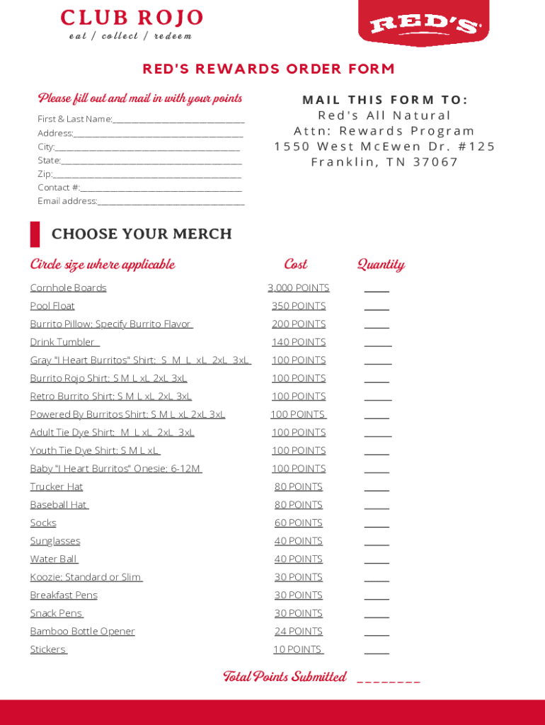 CLUB TOJO eat | collect | redeemed\'S REWARDS ORDER FORM Please fill out and mail in with your points First & Last Name:___ Address:___ City:___ State:___ Zip:___MAIL THIS FORM TO: Red\'s All Natural