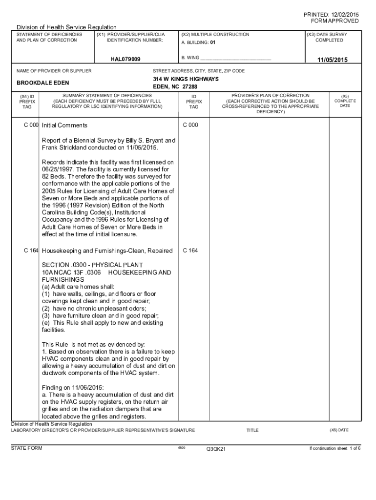 PRINTED: 12/02/2015 FORM APPROVEDDivision of Health Service Regulation STATEMENT OF DEFICIENCIES AND PLAN OF CORRECTION(X1) PROVIDER/SUPPLIER/CIA IDENTIFICATION NUMBER:(X2) MULTIPLE CONSTRUCTION A.