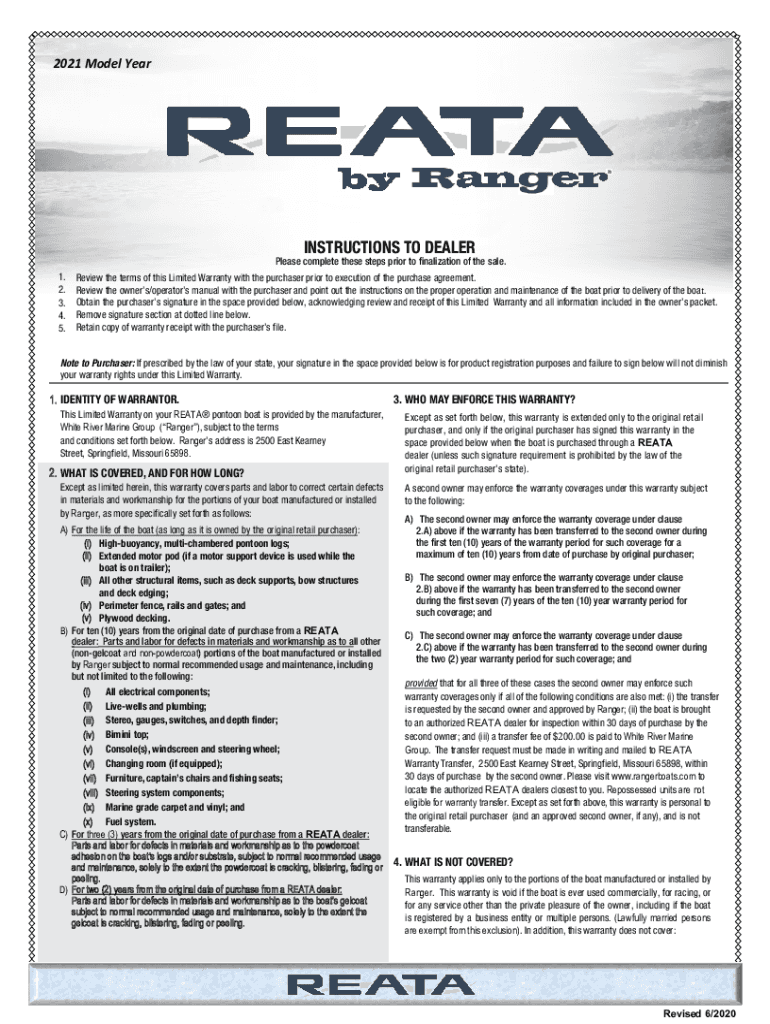 2021 Model Pre-instructions TO DEALERPlease complete these steps prior to finalization of the sale. 1. Review the terms of this Limited Warranty with the purchaser prior to execution of the purchase