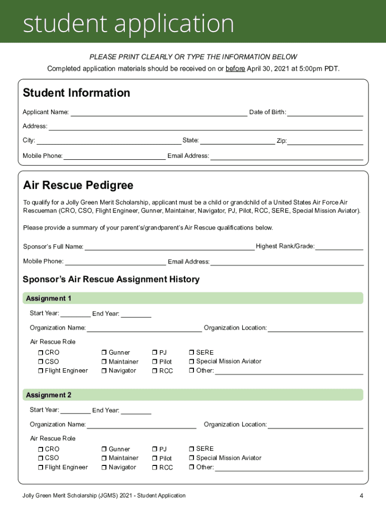 Scholarship application2021 Photo source: https://50skyshades.comJolly Green Association 916 Alma Faye Lane Fort Walton Beach, FL 32547We are pleased to announce the Air Rescue Association (ARA) and