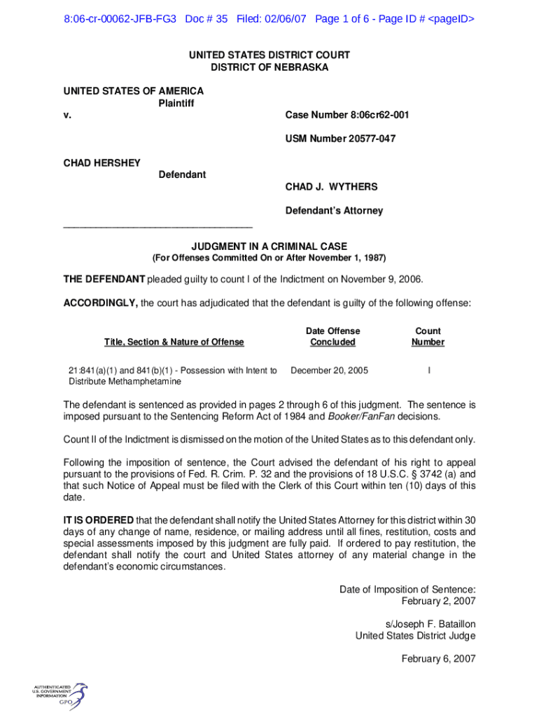 8:06cr00062JFBFG3 Doc # 35 Filed: 02/06/07-Page 1 of 6-Page ID # paged UNITED STATES DISTRICT COURT DISTRICT OF NEBRASKA UNITED STATES OF AMERICA Plaintiff v. Case Number 8:06cr62001 US Number 20577047CHAD