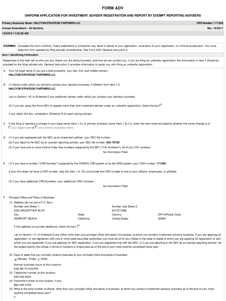 FORM ADV UNIFORM APPLICATION FOR INVESTMENT ADVISER REGISTRATION AND REPORT BY EXEMPT REPORTING ADVISERS Primary Business Name: HALCYON STRATEGIC PARTNERS LLC CRD Number: 171308Annual Amendment All