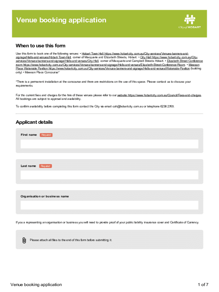 Venue booking applicationWhen to use this form Use this form to book one of the following venues: Hobart Town Hall https://www.hobartcity.com.au/Cityservices/Venuesbannersandsignage/Hallsandvenues/HobartTownHall,
