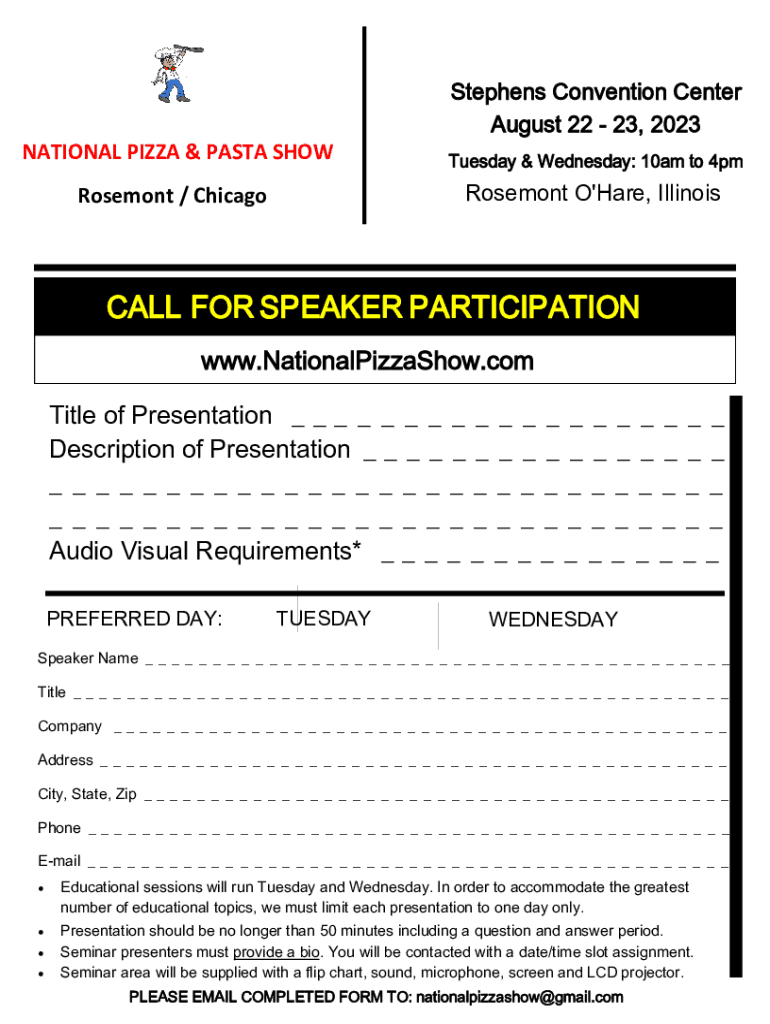 NATIONAL PIZZA & PASTA SHOW Stephens Convention Center August 22 23, 2023 Tuesday & Wednesday: 10am to 4pmRosemont O\'Hare, IllinoisRosemont / Chicagoan FOR SPEAKER PARTICIPATION www.NationalPizzaShow.com