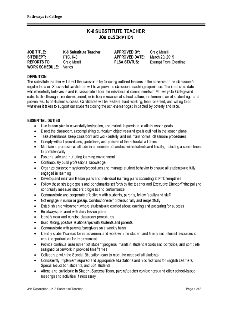 Pathways to CollegeK8 SUBSTITUTE TEACHER JOB DESCRIPTION JOB TITLE: SITE/DEPT: REPORTS TO: WORK SCHEDULE:K8 Substitute Teacher PTC, K8 Craig Merrill VariesAPPROVED BY: APPROVED DATE: FLEA STATUS:Craig