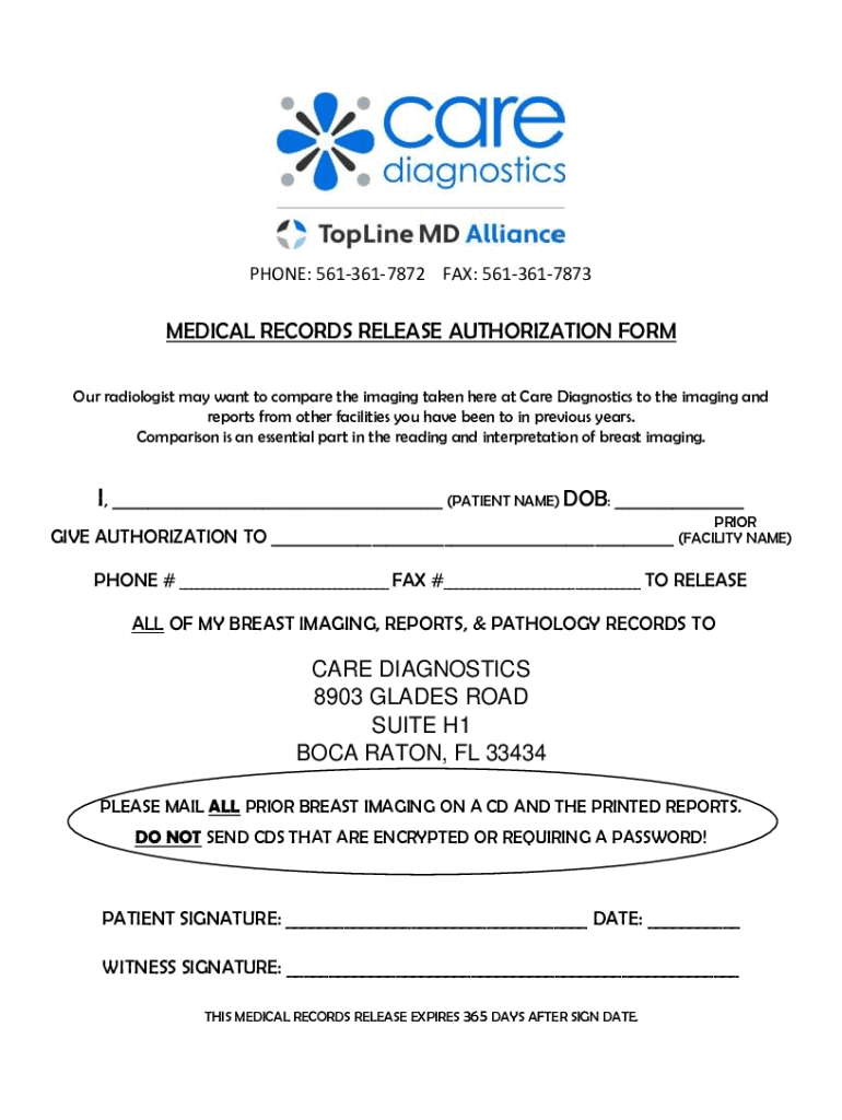 PHONE: 5613617872 FAX: 5613617873MEDICAL RECORDS RELEASE AUTHORIZATION FORM Our radiologist may want to compare the imaging taken here at Care Diagnostics to the imaging and reports from other facilities