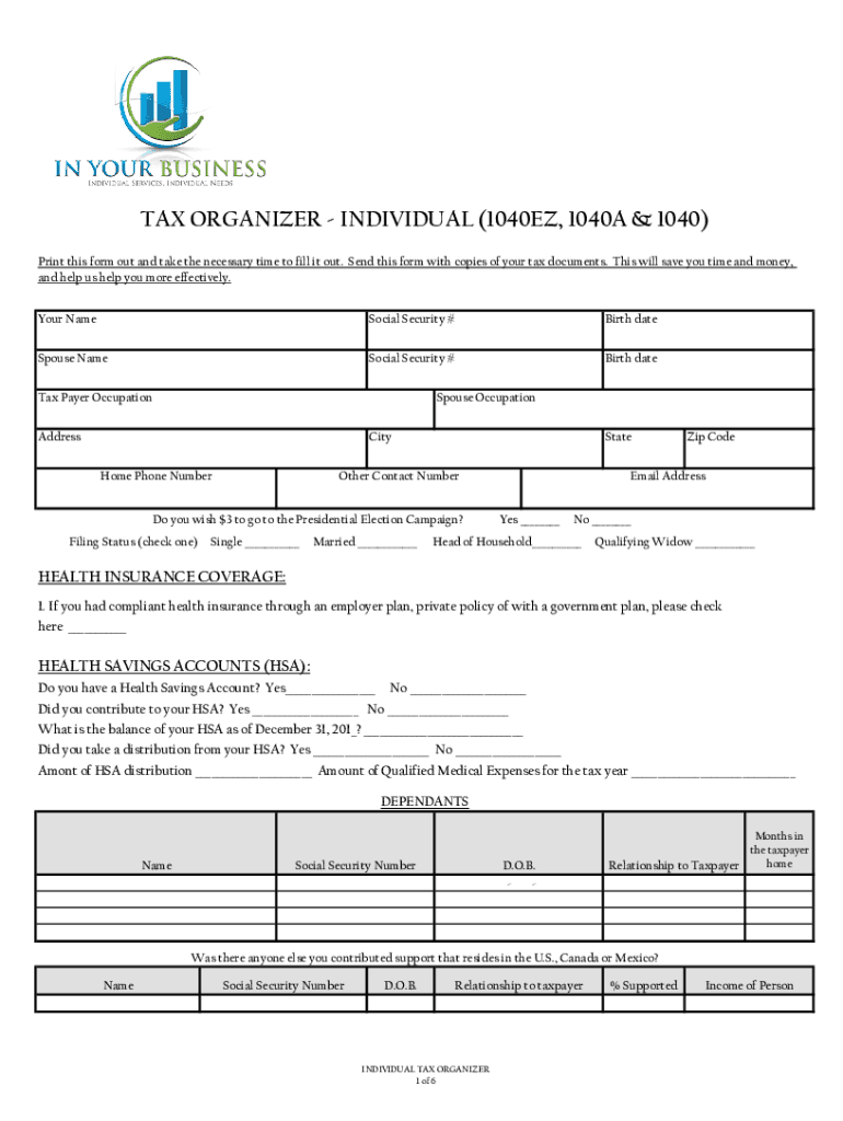 Get the free TAX ORGANIZER - INDIVIDUAL (1040EZ, 1040A & 1040)