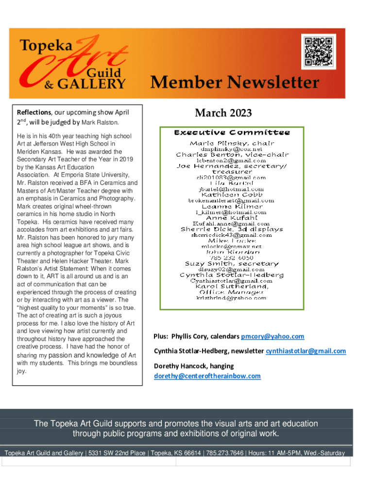 Reflections, our upcoming show April 2nd, will be judged by Mark Alston. He is in his 40th year teaching high school Art at Jefferson West High School in Meriden Kansas. He was awarded the Secondary