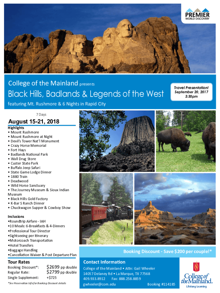 College of the Mainland presentsBlack Hills, Badlands & Legends of the WestTravel Presentation! September 20, 2017 3:30pmfeaturing Mt. Rushmore & 6 Nights in Rapid City 7 Days August 1521, 2018Highlights