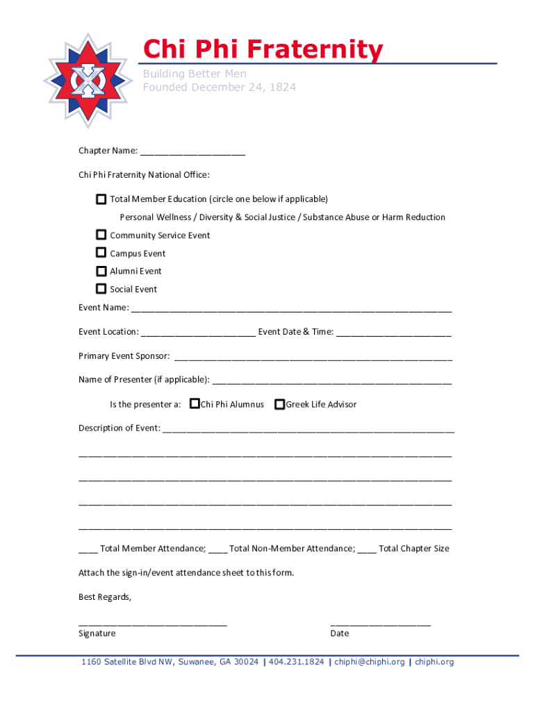 Chi Phi Fraternity Building Better Men Founded December 24, 1824Chapter Name: ___ Chi Phi Fraternity National Office: Total Member Education (circle one below if applicable) Personal Wellness / Diversity