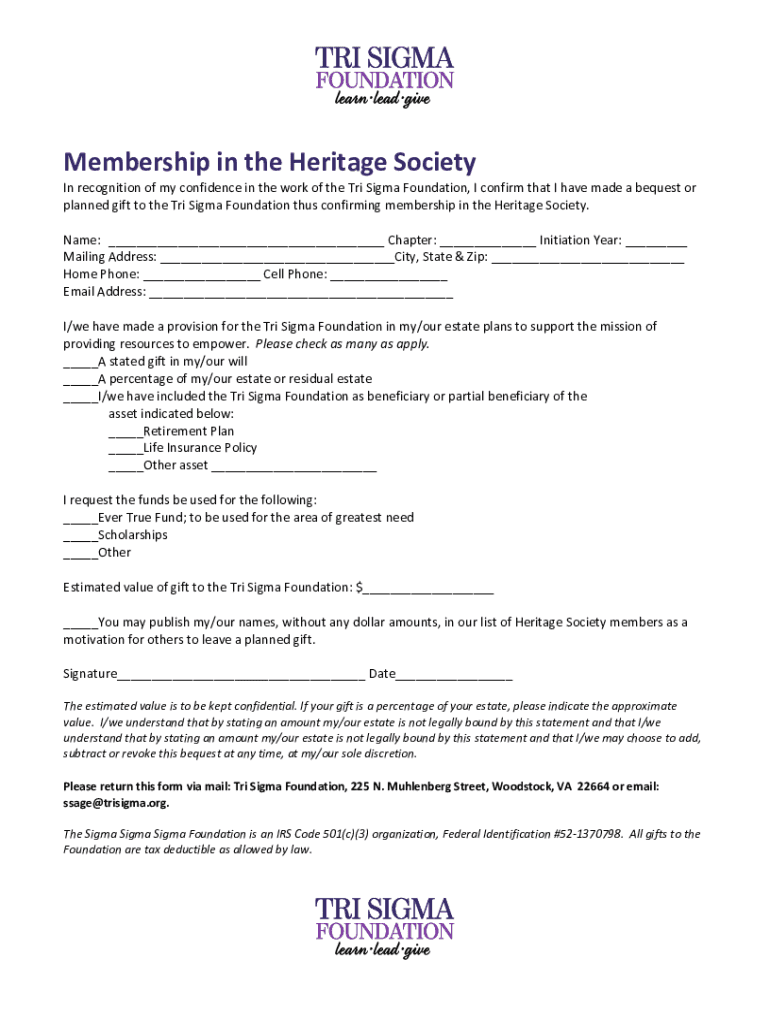 Membership in the Heritage Society In recognition of my confidence in the work of the TRI Sigma Foundation, I confirm that I have made a bequest or planned gift to the TRI Sigma Foundation thus confirming