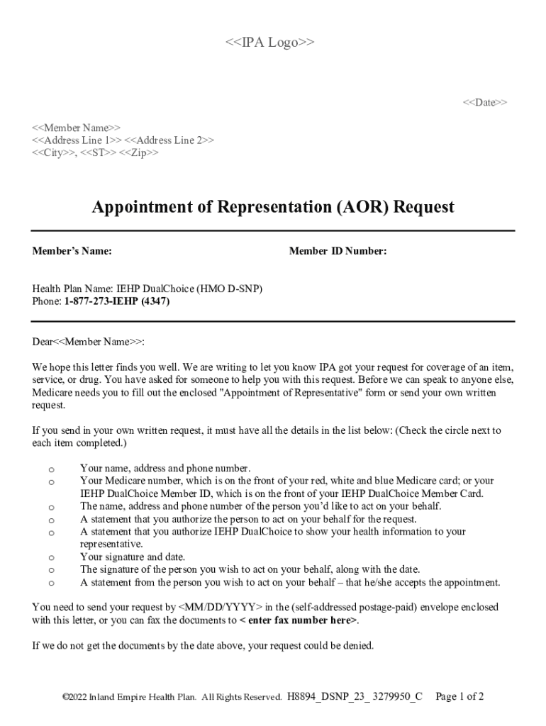 IPA Locate Member Name Address Line 1 Address Line 2 City, ST Disappointment of Representation (AOR) Request Members Name:Member ID Number:Health Plan Name: IEP DualChoice (HMO DSP) Phone: 1877273IEHP