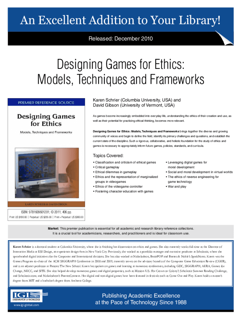 An Excellent Addition to Your Library! Released: December 2010Designing Games for Ethics: Models, Techniques and Frameworks Karen Scarier (Columbia University, USA) and David Gibson (University of