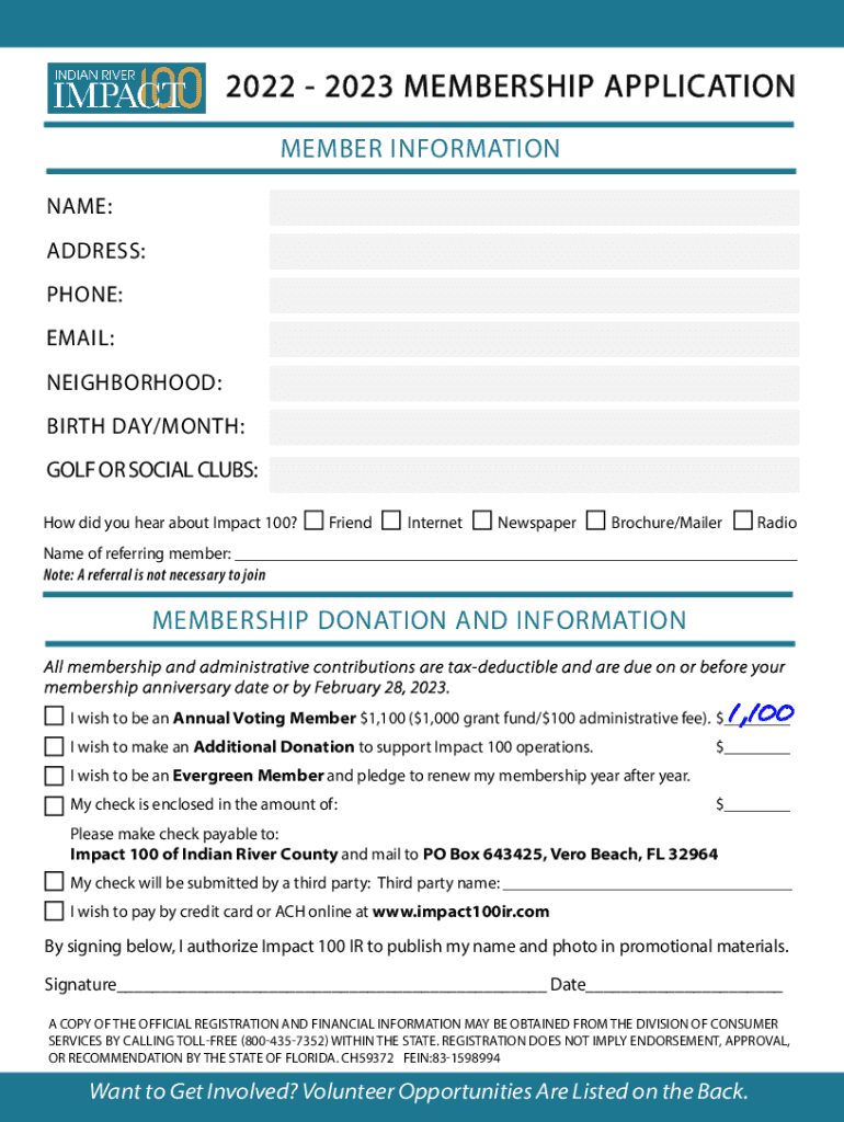 2022 2023 MEMBERSHIP APPLICATION MEMBER INFORMATION NAME: ADDRESS: PHONE: EMAIL: NEIGHBORHOOD: BIRTH DAY/MONTH: GOLF OR SOCIAL CLUBS: How did you hear about Impact 100? FriendInternetNewspaperBrochure/MailerRadioName