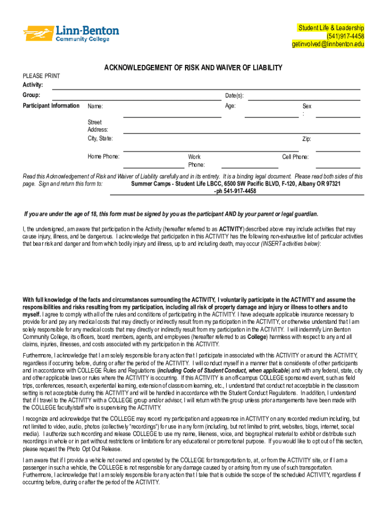 Student Life & Leadership (541)9174458 getinvolved@linnbenton.eduACKNOWLEDGEMENT OF RISK AND WAIVER OF LIABILITY PLEASE PRINT Activity: Group: Participant Informational(s): Age:Name: Street Address: