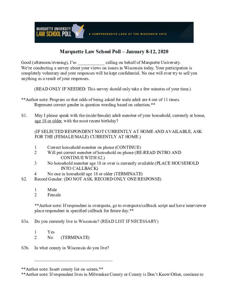 Marquette Law School Poll January 812, 2020 Good (afternoon/evening), I'm ___ calling on behalf of Marquette University. We're conducting a survey about your views on issues in Wisconsin today. Your