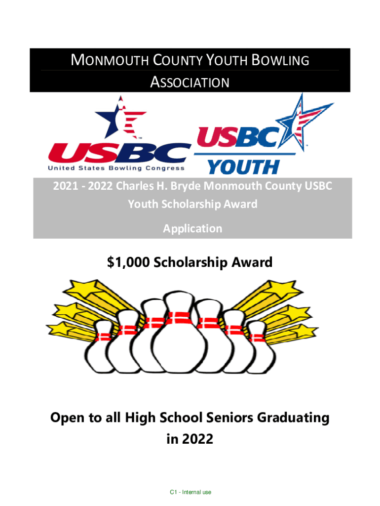MONMOUTH COUNTY YOUTH BOWLING ASSOCIATION2021 2022 Charles H. Bride Monmouth County USB Youth Scholarship Award Application$1,000 Scholarship Awarded to all High School Seniors Graduating in 2022C1