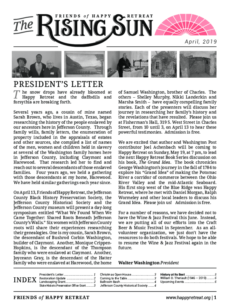 FRIENDS of HAPPYRETREATApril, 2019PRESIDENTS Letter snow drops have already bloomed at Happy Retreat and the daffodils and forsythia are breaking forth. Several years ago, a cousin of mine named Sarah