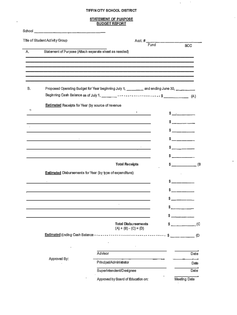 TIFFING CITY SCHOOL DISTRICT STATEMENT OF PURPOSE BUDGET REPORT School ___ _ 1itle of Student Activity Groupable, # ___ Fund sea. Statement of Purpose (Attach separate sheet as needed) ___ ___ ___