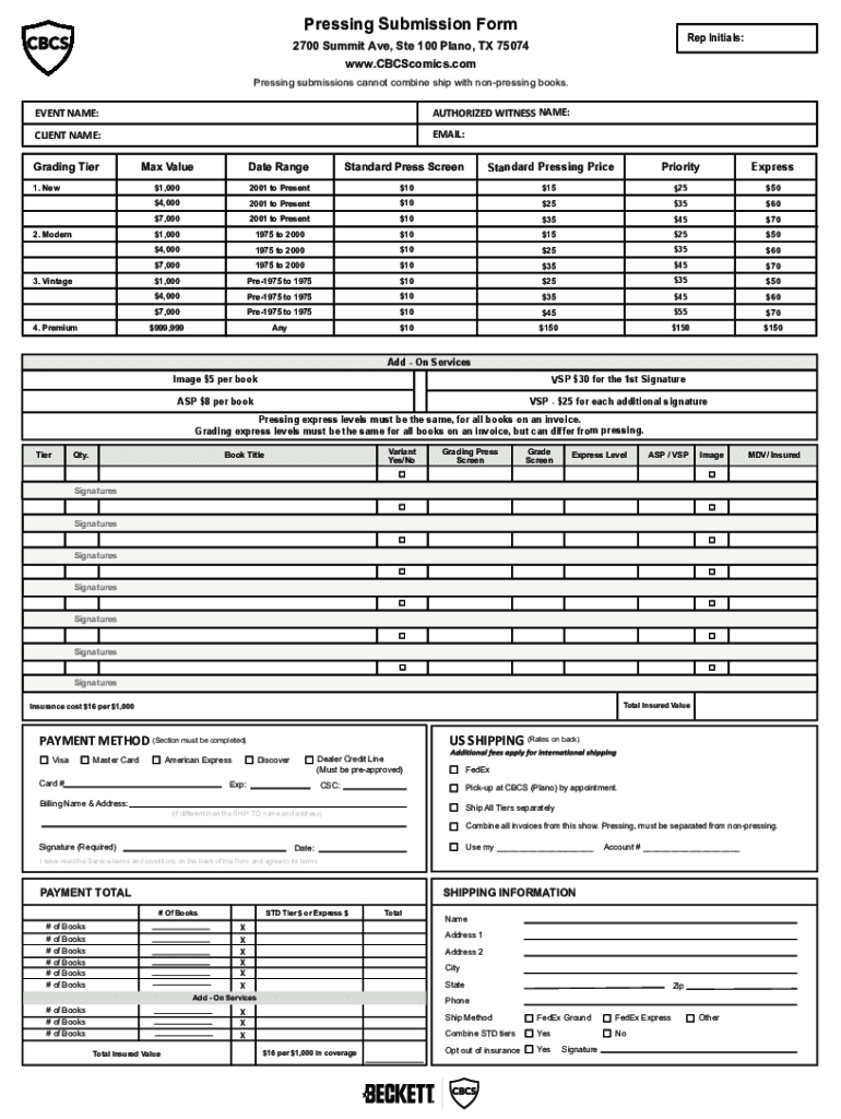 Pressing Submission Form Rep Initials:2700 Summit Ave, Ste 100 Plano, TX 75074 www.CBCScomics.com Pressing submissions cannot combine ship with nonpressing books. EVENT NAME:AUTHORIZED WITNESS NAME:CLIENT