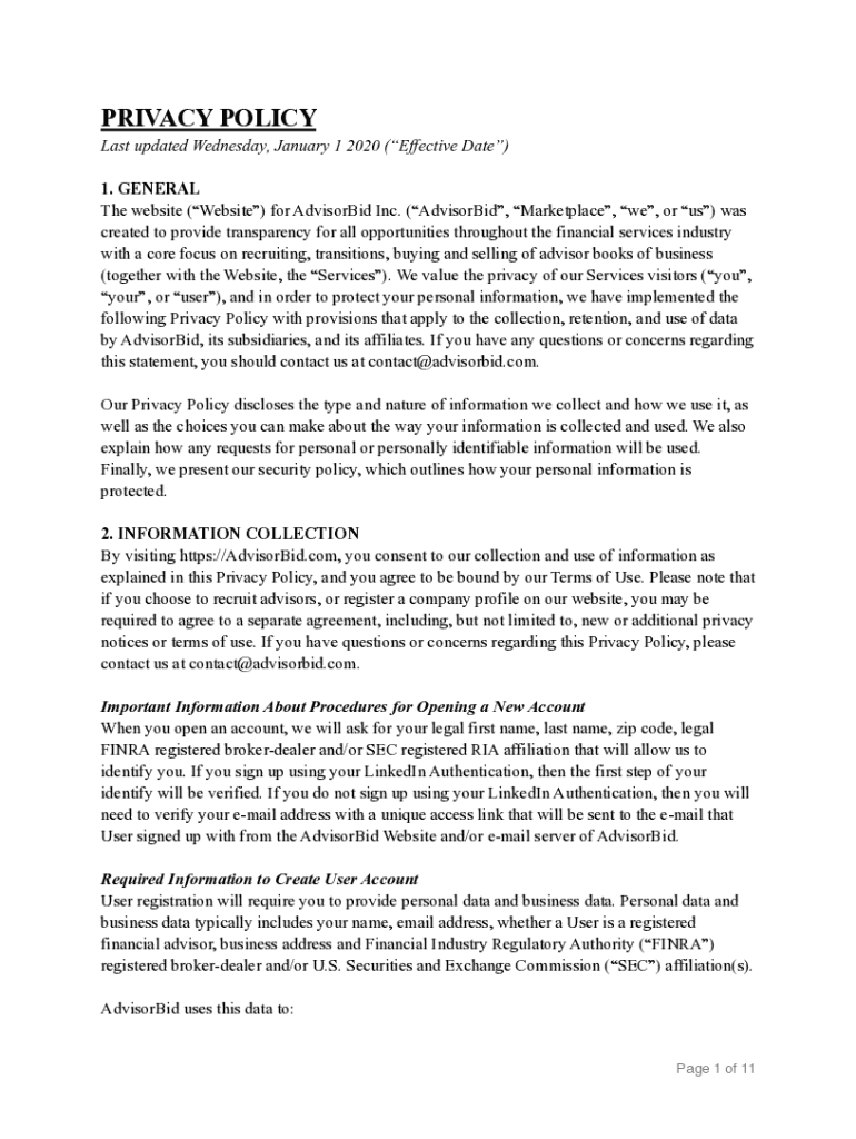 PRIVACY POLICY Last updated Wednesday, January 1 2020 (Effective Date) 1. GENERAL The website (Website) for Advisor Inc. (Advisor, Marketplace, we, or us) was created to provide transparency for all