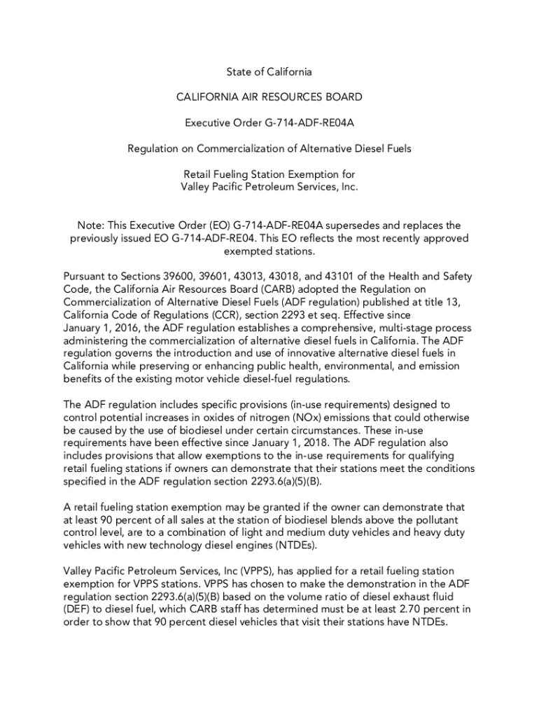 State of California AIR RESOURCES BOARD Executive Order G714ADFRE04A Regulation on Commercialization of Alternative Diesel Fuels Retail Fueling Station Exemption for Valley Pacific Petroleum Services,