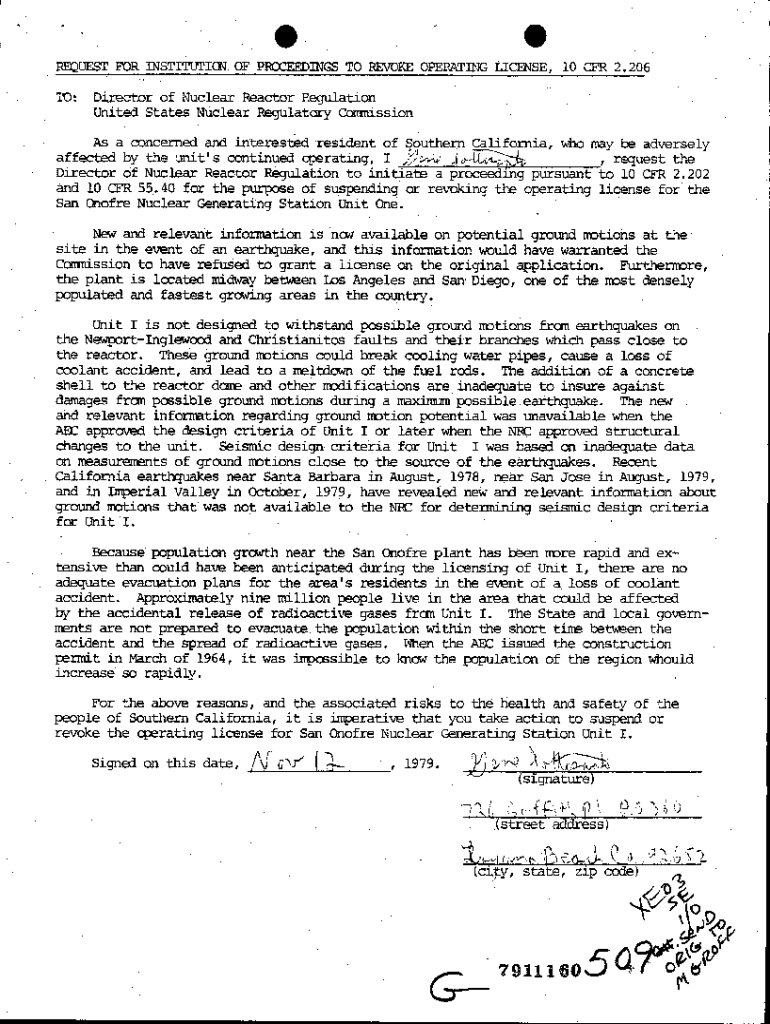 REQUEST FOR INSTITUTION OF PROCEEDINGS TO REVOKE OPERATING LICENSE, 10 CFR 2.206 TO:Director of Nuclear Reactor Regulation United States Nuclear Regulatory Missions a concerned and interested resident
