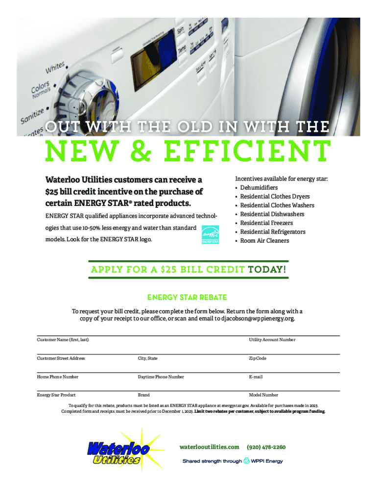 Out with the Old in with then & EFFICIENT Waterloo Utilities customers can receive a $25 bill credit incentive on the purchase of certain ENERGY STAR rated products. ENERGY STAR qualified appliances
