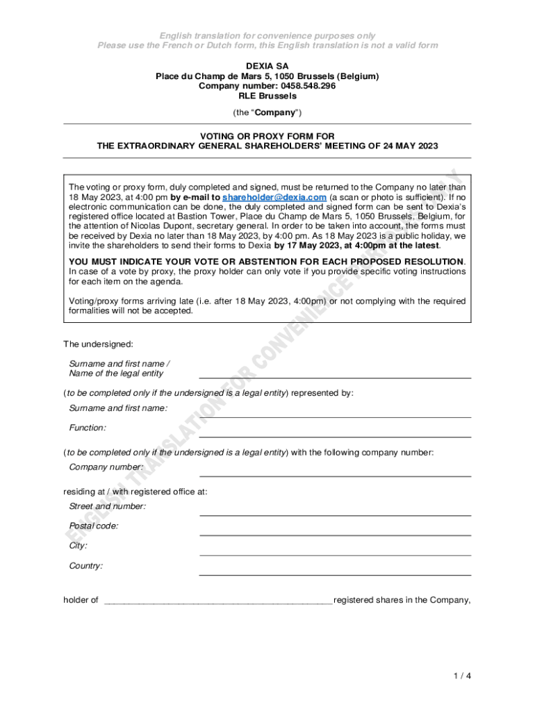 English translation for convenience purposes only Please use the French or Dutch form, this English translation is not a valid form DEXIA SA Place du Champ de Mars 5, 1050 Brussels (Belgium) Company