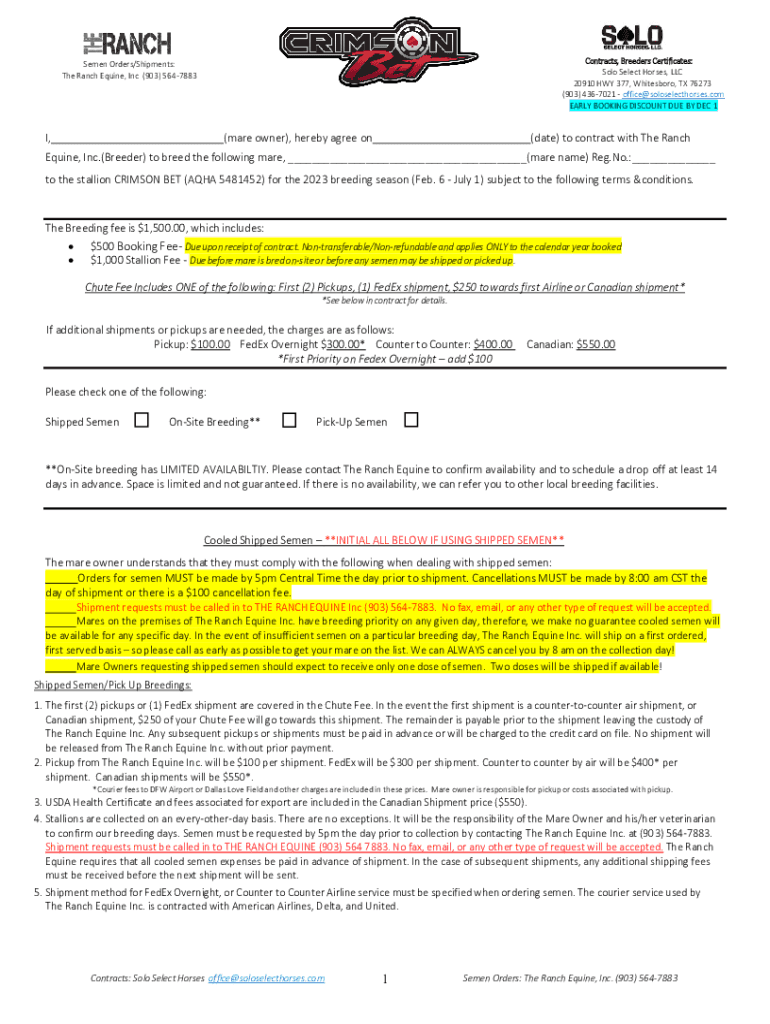 Contracts, Breeders Certificates: Solo Select Horses, LLC 20910 HWY 377, Whiteboard, TX 76273 (903) 4367021 office@soloselecthorses.com EARLY BOOKING DISCOUNT DUE BY DEC 1Semen Orders/Shipments: The