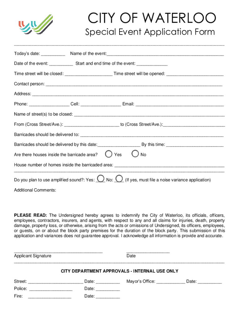 CITY OF WATERLOO Special Event Guide and Application City of Waterloo requires a Special Event Application any time an event or its related components are located inside the Waterloo municipal boundary