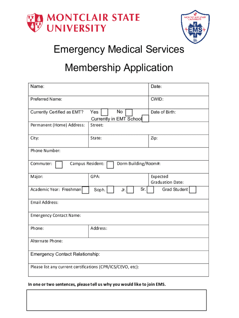 Emergency Medical Services Membership Application Name:Date:Preferred Name:CID: Date of Birth:Permanent (Home) Address:No Yes Currently in EMT School Street:City:State:Zip:Currently Certified as EMT?