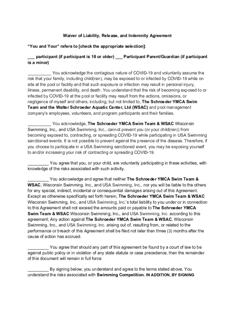 Waiver of Liability, Release, and Indemnity Agreement You and Your refers to [check the appropriate selection]: ___ participant (if participant is 18 or older) ___ Participant Parent/Guardian (if