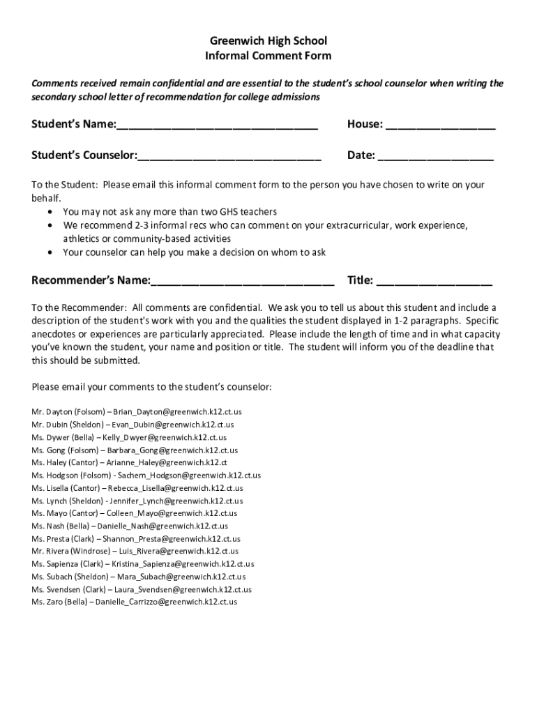 Greenwich High School Informal Comment Form Comments received remain confidential and are essential to the students school counselor when writing the secondary school letter of recommendation for