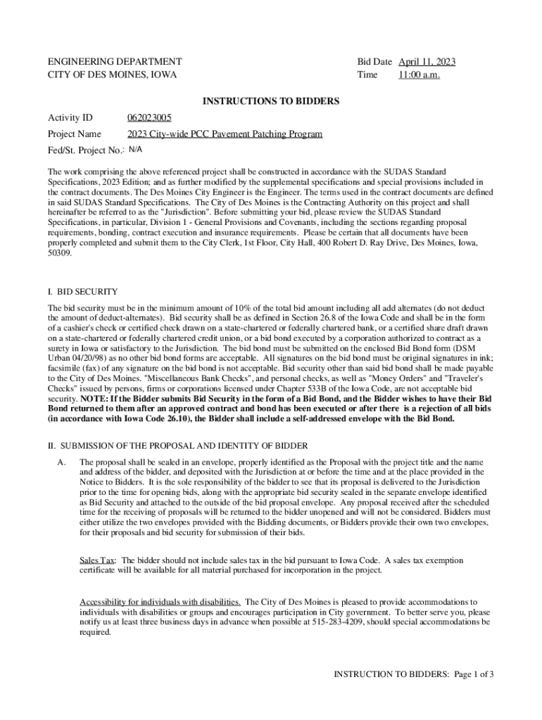ENGINEERING DEPARTMENT CITY OF DES MOINES, Toward Date April 11, 2023, Time 11:00 a.m. INSTRUCTIONS TO BIDDERSActivity ID062023005Project Name2023 Citywide PCC Pavement Patching Programmed/St. Project