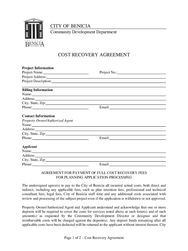 CITY OF BENICIA Community Development Departments RECOVERY AGREEMENT Project Information Project Name: Project Address: Project Description:Project No.:Billing Information Name: Address: City, State,