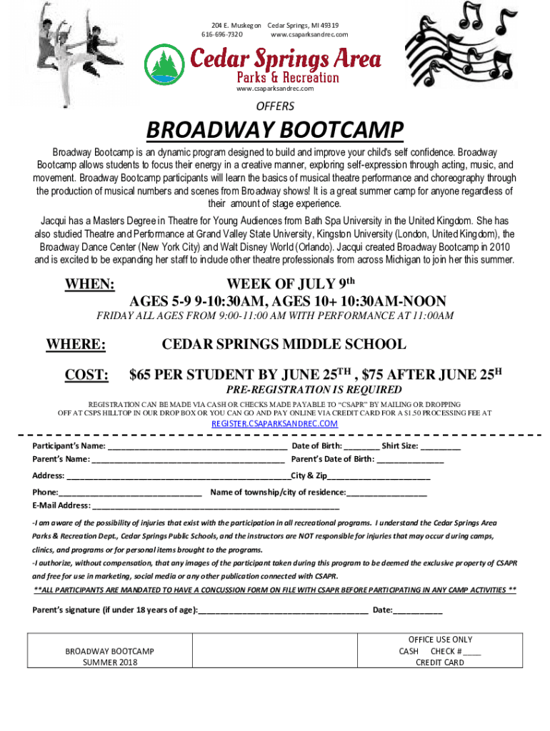 204 E. Muskegon Cedar Springs, MI 49319 6166967320 www.csaparksandrec.comwww.csaparksandrec.comOFFERSBROADWAY BOOKCASE Broadway Boot camp is a dynamic program designed to build and improve your child\'s