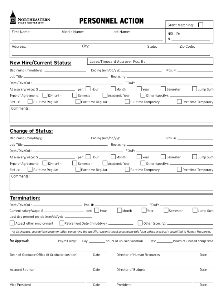 PERSONNEL ACTION First Name:Middle Name:Grant Matching:Last Name:NSU ID: City:Address:State:Zip Code:WY WI WV WA VA VI VT UT TX TN SD SC RI PR PA OR OK OH ND NC NY NM NJ NH NV NE MT MO MS MN MI MA