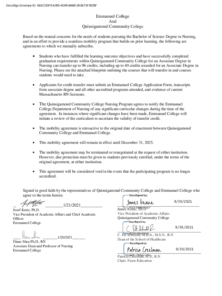 DocuSign Envelope ID: AEEC0DF6A0604D08B4B62A5EF3F9028FEmmanuel College And Quinsigamond Community College Based on the mutual concerns for the needs of students pursuing the Bachelor of Science Degree